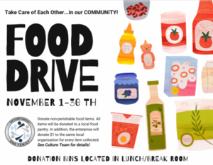 In November, our enterprise’s Culture Core organized food drives to support the community at our locations. Overall, we collected 6,554 items, and TGC matched these contributions with an equivalent monetary donation to support other causes in the same local community organizations.